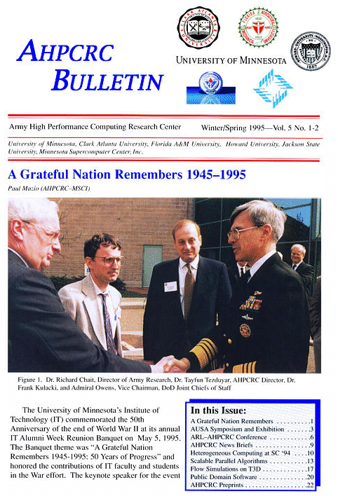 Selected Articles:   Vice Chairman of Joint Chiefs Visits AHPCRC   T*AFSM Research Highlighted at AUSA Symposium and Exhibition   ARL-AHPCRC Conference on Computational Fluid and Solid Mechanics   News Briefs   Heterogeneous Computing Demo at Supercomputing '94   Flow Simulations on T3D |