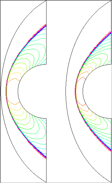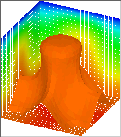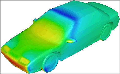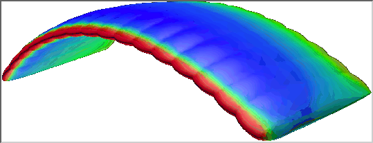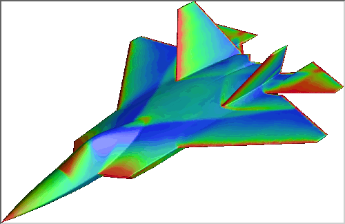 AHPCRC Bulletin: Winter/Spring 1995 - Volume 5 Number 1-2Finite Element Flow Computations on the Cray T3DShahrouz Aliabadi (AHPCRC)This article addresses porting a code developed for the CM-5 to a Cray T3D. A second article addressing optimization on the Cray T3D will appear in the next issue.Driven by large speed and memory requirements of 3D computations, numerical formulations are increasingly adapted for use with a variety of massively parallel supercomputers. However, the style of programming varies from one architecture to another and porting codes across machines while maintaining efficiency becomes a major issue. Recently, the research group of Tayfun Tezduyar (Professor of Aerospace Engineering and Mechanics) at the AHPCRC ported the finite element flow solvers, which were originally developed for the CM-5, to the Cray T3D. Marek Behr, an Assistant Professor at the AHPCRC, performed the porting of the incompressible flow code from the CM-5 to the Cray T3D. Subsequently, this author extended the code to the compressible flow solver. Postdoctoral Research Associate, Andrew Johnson, and graduate student, Vinay Kalro, are also involved in parallel finite element computations on the Cray T3D. The Cray T3D, which is the first massively parallel supercomputer from Cray Research, was officially unveiled in late 1993. This scalable machine with 32 to 2048 processors has a peak performance from 4.8 to over 300 GFLOPS, with memory capacity of 512 Mbytes to 128 Gbytes. The Cray T3D takes advantage of a fast bidirectional 3D torus network which minimizes the inter-processor communication times and ensures short connection paths and high bisection bandwidth. The technical features of the Cray T3D, together with its remarkable stability in operation, makes this machine one of the state-of-the-art systems for parallel computations. As the message-passing programming model was the sole model available to initial T3D users, the existing CM code could only be used as a guide for a new message-passing implementation. This implementation is still based on two distinct main data storage modes the element-level mode and the equation-level mode similar to the CM-5 implementation. In order to minimize inter-processor communication, these two storage modes have to be suitably aligned with contiguous partitions of elements assigned to individual processors. Each processor must hold the data pertaining to both the element partition and a majority of the equations associated with this partition. The necessary communication between the two storage modes is performed via two-step gather and scatter routines, similar in functionality to those available in CM scientific libraries. The inter-processor communication inside the gather and scatter steps, which is now restricted to partition boundary data, is accomplished using send and receive functions of the Parallel Virtual Machine (PVM) library. To improve performance, Cray-specific PVM extensions such as channels are also employed. After a significant amount of scalar code optimization, mostly related to minimizing out-of-cache memory access, the performance of the most computationally intensive parts of the code reached the order of 20 MFLOPS per processing node, and this is comparable to the per-node performance available on the CM-5. The advantages of the T3D include a larger per-processor memory and a smaller communication cost penalty for communication intense algorithms, e.g. more complex preconditioners. The incompressible flow computations on the Cray T3D span from high-speed, high Reynolds number flows to low-speed natural convection flows. The dynamics of ram air parafoils at high Reynolds number, which is one of the major projects at the AHPCRC, is now partially simulated on the Cray T3D. The parafoil computations on the Cray T3D include the steady-state performance during gliding at various angles of attack. The unstructured mesh used for these computations consists of 144,649 nodes and 905,410 tetrahedral elements. Figure 1 shows the pressure distribution on the parafoil surface at zero degree angle of attack and Reynolds number of 10 million. Figure 1. Dynamics of a ram air parafoil. The picture shows the pressure distribution on the parafoil surface. Another example of incompressible flow computations on the Cray T3D is for the aerodynamics of automobiles. Here, airflow past an automobile (modeled after a Saturn) at 55 miles per hour is computed. This computation is carried out on an unstructured mesh consisting of 227,135 nodes and 1,407,579 tetrahedral elements (for half of the domain) under wind tunnel conditions. Figure 2 shows the pressure distribution on the automobile surface. In another project being computed on the Cray T3D, the finite element method is used to simulate the process of transient convection in a volumetrically heated fluid. This computation requires the simultaneous solution of the Navier-Stokes equations coupled with the energy equation. Computations are carried out on a 20 x 20 x 20 structured mesh at Rayleigh number 105 and Prandtl number 6.5. Figure 3 shows the temperature field together with the mesh on three sides of the box and an iso-surface of temperature corresponding to the steady-state solution. The compressible flow research activities on the Cray T3D include the computations of subsonic, transonic, supersonic and hypersonic flows governed by either the Euler or Navier-Stokes equations. An example of supersonic simulations on the Cray T3D, which were carried out to encourage participation of AHPCRC undergraduate research assistants, can be seen in Figure 4. The picture shows the temperature distribution on a fighter aircraft modeled after the Lockheed YF-22. In this computation, the free-stream Mach number is 2 and the compressible flow is assumed to be inviscid and governed by the Euler equations. The computation is carried out on an unstructured mesh consisting of 185,483 nodes and 1,071,580 tetrahedral ele
