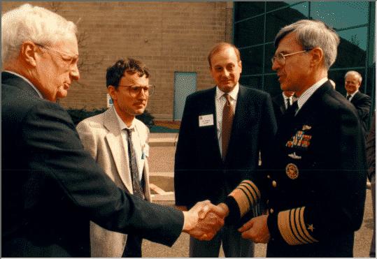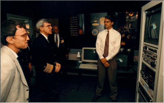 AHPCRC Bulletin: Winter/Spring 1995 - Volume 5 Number 1-2A Grateful Nation Remembers 1945-1995Paul Muzio (AHPCRC-MSCI)The University of Minnesota's Institute of Technology (IT) commemorated the 50th Anniversary of the end of World War II at its annual IT Alumni Week Reunion Banquet on May 5, 1995. The Banquet theme was RA Grateful Nation Remembers 1945-1995: 50 Years of ProgressS and honored the contributions of IT faculty and students in the War effort. The keynote speaker for the event was Admiral William A. Owens, Vice Chairman of the Joint Chiefs of Staff. During World War II, The University of Minnesota campus housed the V-12 Naval Reserve Officers Training Corps program, the Army Reserve Officers Training Corps, the Army Specialized Training Program and other military programs. More than 1,500 students were in the Navy program and several hundred individuals participated in the Army programs. Two alumni Naval officers were killed at Pearl Harbor and a total of 568 University alumni or students were killed during the War. Admiral Owens' keynote speech focused on three major topics affecting defense strategy and priorities: The End of the Cold War; Budgetary Constraints; and, The Revolution in Technology. Admiral Owens indicated that each of the three factors will have a significant impact on the way future wars may be fought and on the requirements for future war fighting tools. The end of the Cold War and the demise of the Soviet Union basically eliminates the possibility of a future large scale, multi-front war against a single, technologically sophisticated adversary. Future wars are more likely to have limited battlefields, on the order of 200 by 200 miles. Potential adversaries will have access to sophisticated weapons including limited numbers of strategic missiles and nuclear, biological and chemical weapons. The military advantage will lie not necessarily with those nations with the strongest economy or technological leadership, but rather with those who are able to most effectively adapt and quickly meld military doctrine, information technology and weapons technology to dynamically changing battlefield conditions. Admiral Owens visited the AHPCRC on May 6. He was welcomed to the Center on behalf of the Army by Dr. Richard Chait, Director of Research and Laboratory Management, Office of the Assistant Secretary of the Army (Research, Development and Acquisition) and on behalf of the University by AHPCRC Director Tayfun Tezduyar. The Admiral was briefed on the research activities of the Center, in particular, the results of collaborative projects with the Army on the use of high performance computing in parafoil modeling, regenerative liquid propellant gun design, resin transfer molding, finite element modeling of fluid flow in spillways, and distributed interactive simulation. The Admiral also toured the AHPCRC and the Minnesota Supercomputer Center facilities. Major General Eugene Andreotti, Adjutant General, Minnesota National Guard and Harold Breaux, Walter Sturek and Charles Nietubicz, Army Research Laboratory, also participated in the tour. |