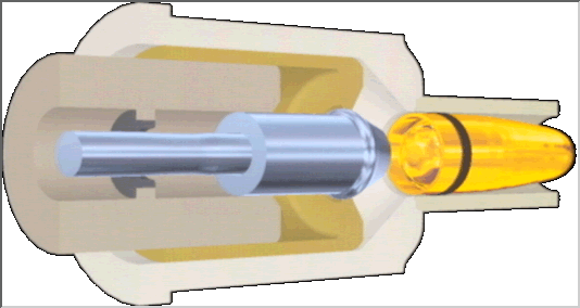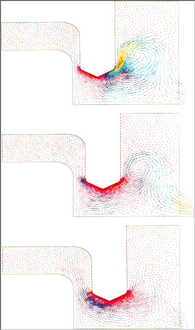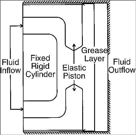 The LP flow field and the piston motion are solved iteratively in each time step. At each time step, first the piston motion is calculated using the LP pressure from the previous time step. The LP flow field is then calculated using that piston motion. A second iteration between the LP flow field and the piston motion is then performed, and the computations proceed onto the next time step. As the pistons move, and as the computational domain changes in size and shape, the mesh must change as well. During each time step, the mesh is updated based on the motion of the pistons using a special mesh moving method developed by the Tezduyar group at the AHPCRC. A new mesh must be generated occasionally to prevent excessive mesh distortion. This is done by using an automatic mesh generator, also developed by the Tezduyar group (see the article by Andrew Johnson in the Fall 1994 AHPCRC Bulletin). The accuracy of the fluid-elastic solid model was demonstrated by modeling a flat plate vibrating both in a vacuum, and with a fluid on one side. Analytical expressions for the natural frequencies of the plate in both cases are available. The computed natural frequencies agree very well with those from the analytical expressions (within 2.4%). In order to test all of the features of the current model, as a last step before the study of the RLPG firing cycle commences, a test problem, based loosely on the RLPG, was studied. The geometry consisted of a linearly elastic, axisymmetric outer piston surrounding a rigid cylinder (see Figure 2). The cylinder is fixed, while the left end of the piston undergoes a known, sinusoidal motion. Figure 3 shows the velocity vectors at three instants during the simulation. These test problems were computed on a Cray C90. Similar finite element methods achieve better computational speeds on massively parallel architectures, so a future goal is the parallelization of this model. In view of the good comparison with the test problems and the parallel potential of the method, it appears that the fluid-elastic solid interaction model can aid in the study of the phenomena which occur during the firing cycle of the RLPG. |