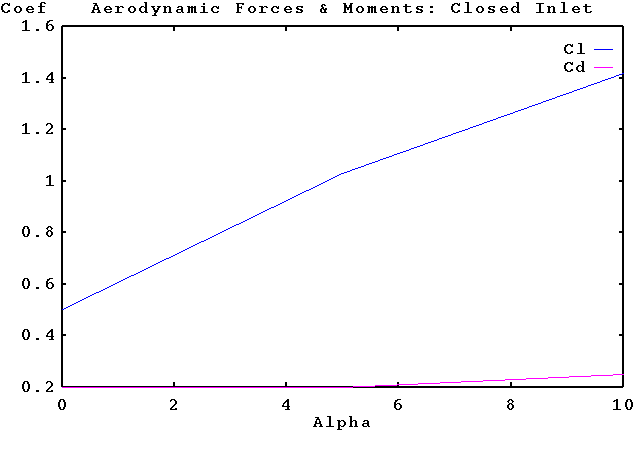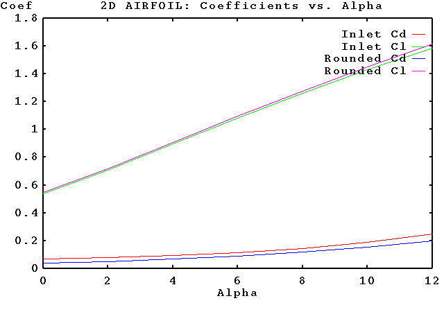 The inlet mesh was compared to the closed rounded mesh, and as we can see, the rounded mesh has a higher coefficient of lift, and a lower coefficient of drag.