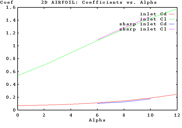 An opened inlet mesh with sharpened opening edges was ran through angles 6 to 10 degrees and compared to the Open-inlet Mesh. There is no significant difference in the coefficients of Lift and Drag.