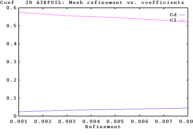 Four refinements of the rounded closed mesh were compared in this plot. Refinement values of 0.001, 0.003. 0.005, 0.008 were used. As we can see from the trend of this plot, as the refinement becomes less, (from .001 to .008) the values of lift decrease, while the values of drag increase.