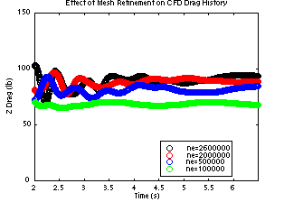 Shown above at right is a plot of drag histories for the four CFD simulations of differing mesh refinements. The histories show similar trends, and again demonstrate that drag appears to converge with increased mesh refinement.
