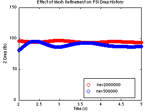 Shown above at right is a plot of drag histories for the two FSI simulations of differing mesh refinements. The histories show similar trends, and due to the similarity of the FSI drag histories with the CFD drag histories, it is guessed with confidence that were more FSI simulations to be conducted with higher mesh refinements, convergence to some value of average drag would be seen.