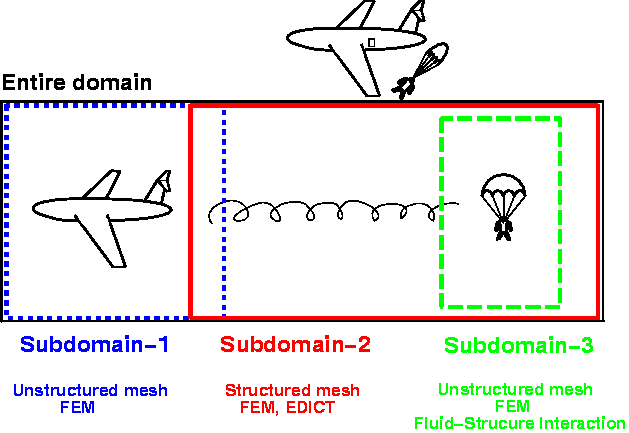 Principal Investigator: This project is part of a greater research effort by the T*AFSM on airdrop systems. Our research on airdrop systems involves extensive collaborations with US Natick Soldier Center and NASA Johnson Space Center. The T*AFSM is working on developing the methods and tools needed to simulate the effect of unsteady wake flow on a paratrooper jumping out of a trailing aircraft and crossing the wake of the leading aircraft. In this project, Mr. McCune and Mr. Kumar were helped by Dr. Yasuo Osawa, at that time a PhD student supervised by Tezduyar.
