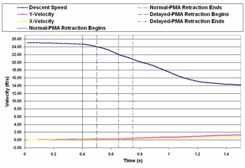 Figure 2: Payload velocity for a case where the retraction of one of the four PMAs is delayed. |