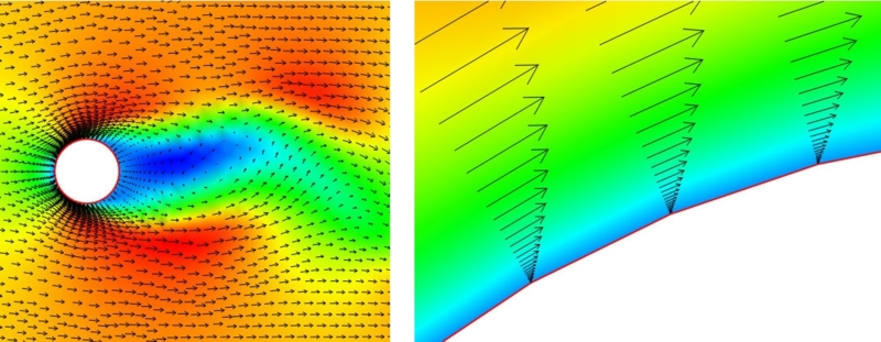 Figure 2: Flow past a cylinder: velocity vectors and horizontal component of velocity. |