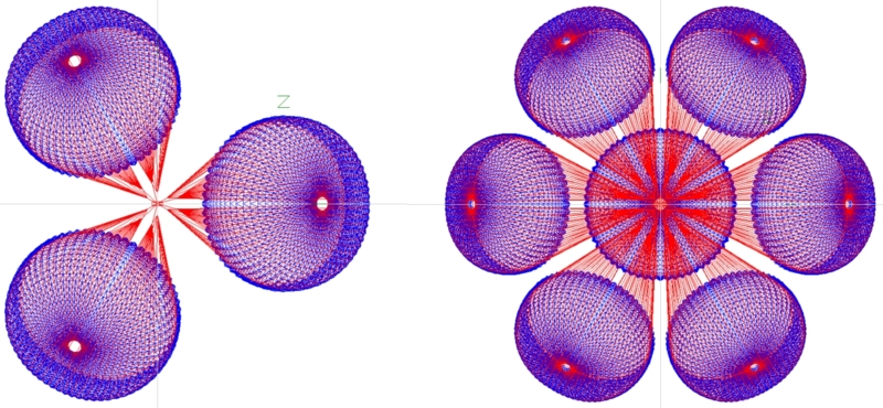 Figure 1: Top views of clusters of G-12 parachutes. 2D Flow VisualizationThis program was developed to visualize 2D meshes and display output data using an adjustable range of colors. For 2D incompressible flows, the program will also calculate and display velocity vectors, divergence, and curl. The user can take screenshots in postscript, jpeg, and gif formats. Adjustable settings include color schemes, line widths, vector lengths and arrowhead sizes. Camera movement and zoom functionality can be controlled by the mouse or the keyboard.