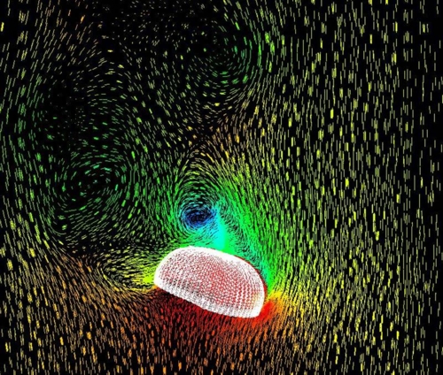 Figure 2. G-12 parachute moving to the right. Velocity vectors are colored with pressure. |