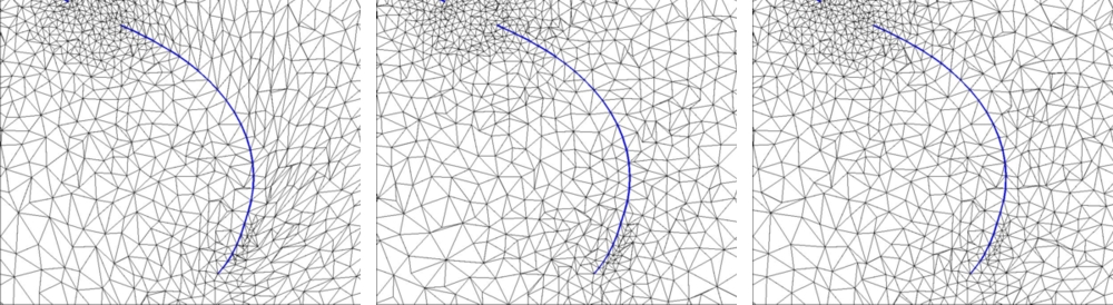 Figure 1. Sections of the meshs around a rotating T-10 parachute. Deformed mesh (left), mesh after remesh-renode (middle) and mesh after remesh-reconnect(right). |