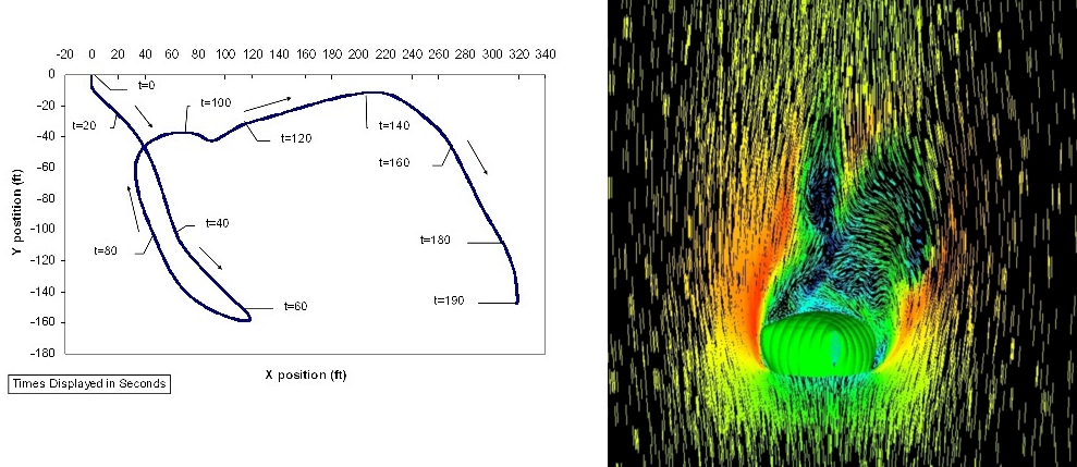 Figure 1. Possible trajectories of a parachute experiencing geometry-induced glide (left) and a velocity field surrounding the parachute in descent(right). |