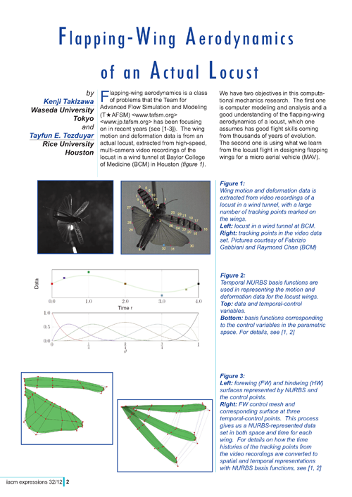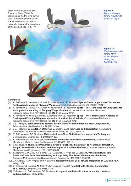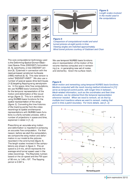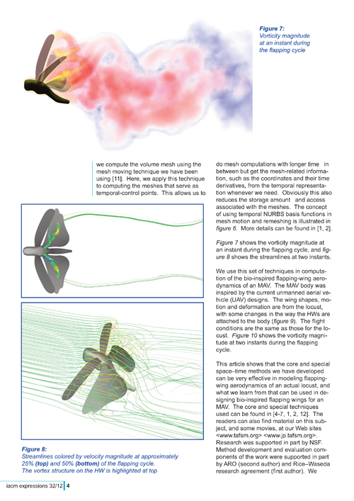 References in the Article1. K. Takizawa, B. Henicke, A. Puntel, T. Spielman and T.E. Tezduyar, "Space-Time Computational Techniques for the Aerodynamics of Flapping Wings", Journal of Applied Mechanics, 79 (2012) 010903, doi: 10.1115/1.4005073".2. K. Takizawa, B. Henicke, A. Puntel, N. Kostov and T.E. Tezduyar, "Space-Time Techniques for Computational Aerodynamics Modeling of Flapping Wings of an Actual Locust", Computational Mechanics, 50 (2012) 743-760, doi: 10.1007/s00466-012-0759-x. 3. K. Takizawa, N. Kostov, A. Puntel, B. Henicke and T.E. Tezduyar, "Space-Time Computational Analysis of Bio-inspired Flapping-Wing Aerodynamics of a Micro Aerial Vehicle", Computational Mechanics, 50 (2012) 761-778, doi: 10.1007/s00466-012-0758-y. 4. T.E. Tezduyar, "Stabilized Finite Element Formulations for Incompressible Flow Computations", Advances in Applied Mechanics, 28 (1992) 1-44, doi: 10.1016/S0065-2156(08)70153-4. 5. T.E. Tezduyar, "Computation of Moving Boundaries and Interfaces and Stabilization Parameters", International Journal for Numerical Methods in Fluids, 43 (2003) 555-575, doi: 10.1002/fld.505. 6. K. Takizawa and T.E. Tezduyar, "Multiscale Space-Time Fluid-Structure Interaction Techniques", Computational Mechanics, 48 (2011) 247-267, doi: 10.1007/s00466-011-0571-z. 7. K. Takizawa and T.E. Tezduyar, "Space-Time Fluid-Structure Interaction Methods", Mathematical Models and Methods in Applied Sciences, 22 (supp02) (2012) 1230001, doi: 10.1142/S0218202512300013. 8. T.J.R. Hughes, "Multiscale Phenomena: GreenŐs Functions, the Dirichlet-to-Neumann Formulation, Subgrid Scale Models, Bubbles, and the Origins of Stabilized Methods", Computer Methods in Applied Mechanics and Engineering, 127 (1995) 387-401. 9. Y. Bazilevs, V.M. Calo, J.A. Cottrell, T.J.R. Hughes, A. Reali and G. Scovazzi, "Variational Multiscale Residual-Based Turbulence Modeling for Large Eddy Simulation of Incompressible Flows", Computer Methods in Applied Mechanics and Engineering, 197 (2007) 173-201. 10. J.A. Cottrell, T.J.R. Hughes and Y. Bazilevs, Isogeometric Analysis: Toward Integration of CAD and FEA, Wiley (2009). 11. T. Tezduyar, S. Aliabadi, M. Behr, A. Johnson and S. Mittal, "Parallel Finite Element Computation of 3D Flows", Computer, 26 (1993) 27-36, doi: 10.1109/2.237441. 12. Y. Bazilevs, K. Takizawa and T.E. Tezduyar, Computational Fluid-Structure Interaction: Methods and Applications, Wiley (2013), doi: 10.1002/9781118483565. |