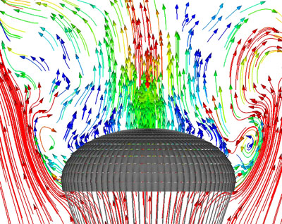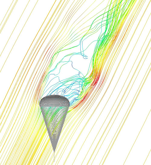 | Fig. 4. Flow past the drifting parachute (side wind = 12.5 ft/s). For details, see [8, 9]. |