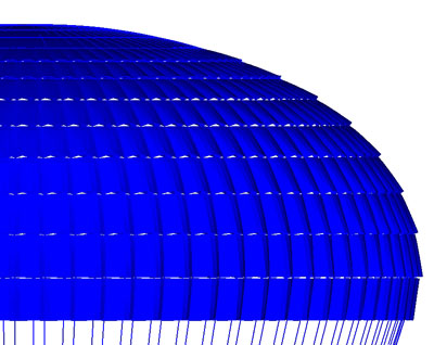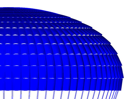 It is expected that NASA will be using a cluster of three ringsail parachutes during the terminal descent of the Orion spacecraft. These parachutes, referred to as the "mains", are being designed to support a weight of approximately 15,000 lbs at a steady descent speed of approximately 25 ft/s. Each parachute has 80 gores and a nominal diameter of about 120 ft. It has 4 "rings" and 9 "sails" (see [8, 9] for the terminology). To better understand the performance of the mains, we are modeling a single main parachute, carrying one third of the total weight of the space vehicle. We simulate the offloading, which involves dropping the heat shield prior to landing, and the drifting under the influence of a side wind at 12.5 ft/s.