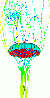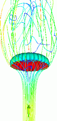 Flow Past a Paratrooper with an Open ParachuteIn this simulation, a paratrooper/parachute system is modeled as a rigid body, and there is no relative motion between the paratrooper and the parachute. The paratrooper geometry is modeled after an average person. The parachute is modeled after a C-9 parachute, a typical personnel parachute used by the Army. The chute has a constructed diameter of 28 ft, and a line length of 23 ft. The rate of descent is 20 ft/s. The free-stream conditions are modeled after standard sea-level conditions. The 3D finite element mesh used in this simulation consists of 180,442 nodes and 1,072,572 tetrahedral elements. Computations were carried out on a CRAY T3D. A time-dependent simulation was run for about 1300 time steps, 65 seconds of real time. The images below show pathlines colored with magnitude of velocity starting at the same location for three different time instants, as well as the pressure distribution on each surface at the time instance the pathlines were started. Using the last 15 seconds of the time-dependent data, a time averaged drag coefficient was found and compares quite well with experimental data. The unstructured mesh generator, flow solver, and flow visualization software (based on Ensight) were developed by the T*AFSM.