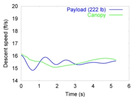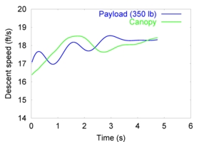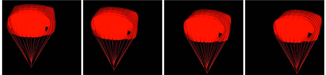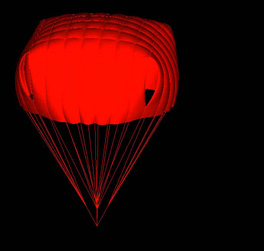 Descent and Glide of a Complex Parachute DesignHere we focus on computer modeling of the descent and glide of a complex parachute design resembling the ATPS (XT-11) parachute. The fluid-structure interaction (FSI) of the parachute decent is simulated for payload levels of 222 and 350 lbs. We also model the aerodynamic and FSI response of the parachute when one of the risers is pulled to induce glide. The simulations are carried out in a parallel computing environment with the parallel FSI solver written by the T*AFSM. The underlying methods of the FSI solver were introduced by the T*AFSM over the years. These methods include: the Deforming-Spatial-Domain/Stabilized Space-Time (DSD/SST) formulation [1-4], an automatic mesh update technique [5], and the quasi-direct fluid-structure coupling method [6-7]. For more on this computation, see [8].