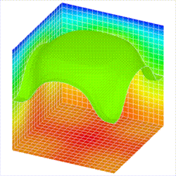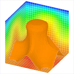 This simulation is carried out to study natural convection in a fluid layer with an internal heat source. The Rayleigh and Prandtl numbers are 100,000 and 6.7, respectively. This simulation was carried out on a CRAY T3D using a structured finite element mesh with 20x20x20 cells. The images show the temperature field together with the mesh on three sides corresponding to the steady-state solution. The flow solver and flow visualization software (based on Visual3 library and BoB) were developed by the T*AFSM. References:1. T.J.R. Hughes, T.E. Tezduyar and A.N. Brooks, "Streamline Upwind Formulations for Advection-Diffusion, Navier-Stokes, and First-order Hyperbolic Equations", Proceedings of the Fourth International Conference on Finite Element Methods in Fluid Flow, University of Tokyo Press, Tokyo (1982). 2. T.E. Tezduyar and D.K. Ganjoo, "Petrov-Galerkin Formulations with Weighting Functions Dependent Upon Spatial and Temporal Discretization: Applications to Transient Convection-Diffusion Problems", Computer Methods in Applied Mechanics and Engineering, 59 (1986) 49-71. 3. T.E. Tezduyar and J. Liou, "Adaptive Implicit-Explicit Finite Element Algorithms for Fluid Mechanics Problems", Computer Methods in Applied Mechanics and Engineering, 78 (1990) 165-179. 4. T.E. Tezduyar, "Stabilized Finite Element Formulations for Incompressible Flow Computations", Advances in Applied Mechanics, 28 (1991) 1-44. 5. T.E. Tezduyar, S. Mittal and R. Shih, "Time-accurate Incompressible Flow Computations with Quadrilateral Velocity-Pressure Elements", Computer Methods in Applied Mechanics and Engineering, 87 (1991) 363-384. 6. T.E. Tezduyar, S. Mittal, S.E. Ray and R. Shih, "Incompressible Flow Computations with Stabilized Bilinear and Linear Equal-order-interpolation Velocity-Pressure Elements", Computer Methods in Applied Mechanics and Engineering, 95 (1992) 221-242. 7. T. Tezduyar, S. Aliabadi, M. Behr, A. Johnson, V. Kalro and M. Litke, "High Performance Computing Techniques for Flow Simulations", Chapter 10 in Parallel Solution Methods in Computational Mechanics (ed. M. Papadrakakis), John Wiley & Sons (1997) 363-398. |