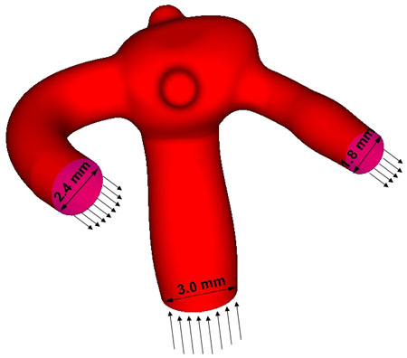 The arterial geometry (see Fig. 1) used here is a close approximation to the computed tomography (CT) model of a bifurcating-artery segment of the middle cerebral artery of a 59 year-old female with aneurysm. The arterial wall (i.e. the structural mechanics part of the problem) is modeled with the membrane element.
