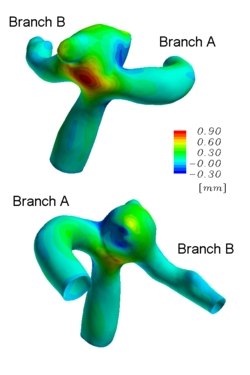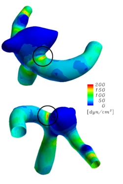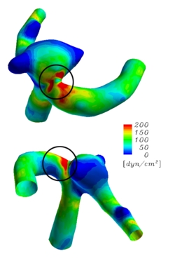Wall Shear Stress Calculations for a Middle Cerebral Artery Bifurcation with AneurysmThe Deforming-Spatial-Domain/Stabilized Space-Time (DSD/SST) formulation was introduced in [1-3] for flow problems with moving boundaries and interfaces and has been applied to a large class of problems, including fluid-structure interactions (FSI). In this joint work with Ryo Torii and Marie Oshima (University of Tokyo), the version of the DSD/SST formulation introduced in [4] is applied to computation of the FSI and wall shear stress for a middle cerebral artery bifurcation with aneurysm. This joint work is described fully in [5]. The computations were carried out by Ryo Torii, using a computer program he wrote with guidance and help from the T*AFSM. The computer model was extracted from the computed tomography (CT) model of the middle cerebral artery bifurcation of a 59 year-old female patient. In the FSI computation, the arterial walls are assumed to be made of a linearly elastic material, but the geometric nonlinearities are accounted for. A computation was carried out also with a model where the arterial walls are assumed to be rigid, so that we can see the importance of taking into account the FSI between the blood flow and the arterial walls. The computations show that taking such FSI into account makes a significant difference in the predicted values of the wall shear stress.