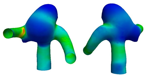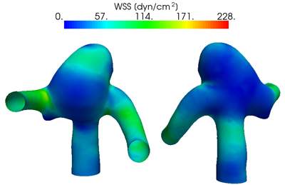 The numerical methods used in this computation were introduced and implemented on parallel computing platforms by the T*AFSM. The set of numerical methods introduced by the T*AFSM over the years and used in this computation includes the DSD/SST formulation [1-4], the quasi-direct FSI method [5, 6], the stabilized space-time FSI (SSTFSI) technique [7], special techniques for arterial FSI computations [8-11], and a multiscale sequentially-coupled arterial FSI technique [12]. The lumen geometry was used earlier in simulations reported in [13, 14]. The inflow volumetric flow rate is calculated (see [11]) from the maximum-velocity waveform used in [13]. The inflow velocity profile (in space and time) is calculated (see [11]) based on this volumetric flow rate by using a special mapping technique introduced in [11]. The traction condition imposed at the outflow boundary during the cardiac cycle is based on a normal blood pressure profile, which is calculated (see [11]) by using the Windkessel model and the inflow volumetric flow rate. The inflow volumetric flow rate and the pressure profile can be seen at Cerebral Aneurysm -- High-Resolution Wall Shear Stress. We use a variation of the "estimated zero-pressure arterial geometry" method that was introduced in [9]. In this variation (see [11]), we use variable wall thickness for the artery. The zero-pressure configuration, the wall thickness normalized by the wall thickness at the inflow, and the structural mechanics mesh can be seen at Cerebral Aneurysm -- High-Resolution Wall Shear Stress. One of the special arterial FSI techniques used in the computation is generating meshes with layered, high-refinement zones in the normal direction near the arterial walls to improve the boundary layer resolution (see [10, 11]). In the computations reported here, two meshes are used: a coarse mesh and a fine mesh with such layered, high-refinement zones. The coarse and fine meshes have the same triangular mesh at the arterial wall, which is shown in Fig. 1. The coarse and fine fluid mechanics meshes at the inflow plane are shown in Fig. 2. We first compute the arterial shape with the (fully) coupled arterial FSI (CAFSI) technique and the coarse mesh. Given the arterial shape as a function of time during a cardiac cycle, we follow with mesh motion and fluid mechanics computations with the refined mesh. We call this approach the Multiscale Sequentially-Coupled Arterial FSI (SCAFSI M1C) technique. For comparison purpose, we also compute with the CAFSI technique and the fine mesh. The layered, high-refinement meshes near the arterial wall give us higher-resolution wall shear stress (WSS) values (see Figs. 3-5), and as can be seen from the figures, the WSS distributions obtained with the SCAFSI M1C technique are close to those obtained with the CAFSI technique and the fine mesh. For more details on these computations, see [12].