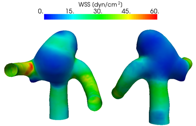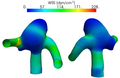 Fig. 4. WSS distributions from the SCAFSI M1C technique when the volumetric flow rate is maximum (left) and when the outflow pressure is maximum (right). For details, see [12].