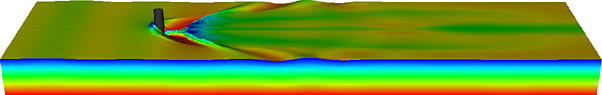 Free-Surface Flow Past a CylinderIn this study, we simulate free-surface flow past a circular cylinder standing vertically. The Reynolds number based on upstream velocity and cylinder diameter is 10 million. The upstream Froude number is 0.564. The Deformable-Spatial- Domain/Stabilized Space-Time (DSD/SST) formulation is used with an algebraic mesh update method to solve this problem. The mesh consists of 230,480 triangular-based prism elements and 258,764 space-time nodes. The free surface height is governed with kinematic free-surface condition and solved with, again, a stabilized formulation. The figures below show, at an instant, the cylinder together with the free surface color-coded with the velocity magnitude and side boundary surface color-coded with the fluid pressure. The bow wave in front of the cylinder, the hydraulic jump behind, and the V- shaped waves in the wake are characteristics of this flow problem. The computations were carried out on a CM-5. The mesh generator and flow solver were developed by the T*AFSM