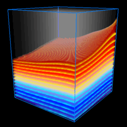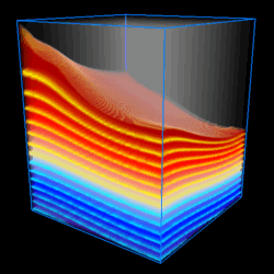 Water Sloshing in a Vibrating ContainerHere we perform a 3D study of sloshing in a container subjected to vertical vibrations. The experimental and theoretical evidence indicates the existence of multiple solution branches when the horizontal cross-section of the container is nearly square. Depending on the frequency of the vibrations, the competing wave modes interact, generating complex periodic, as well as chaotic, wave behavior.The mesh consists of 7,056 nodes and 6,000 quadrilinear brick elements which result in 52,878 equations that are solved iteratively. The simulation was carried out on a CM-200. The figures below show the free-surface displacement and the pressure field at two instants during the simulation.