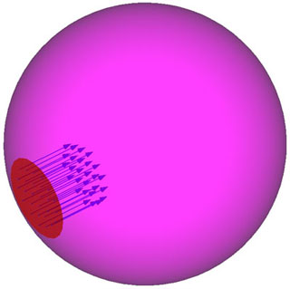 A balloon, initially spherical, is inflated by pumping an air-like fluid through a circular hole as shown in Fig. 1. The inflow is pulsating in the form of a Cosine wave with period 2 s. The minimum and maximum values of the magnitude of the inflow velocity are 0.0 m/s and 2.0 m/s. Initially, the diameter of the balloon is 2 m and the diameter of the circular hole is 0.63 m. The thickness, density and stiffness of the balloon are 2.0 mm, 100 kg/m3 and 1000 N/m2, respectively. The density and viscosity of the fluid are 1.0 kg/m3 and 0.000015 m2/s.