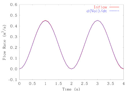 | Fig. 2. Volumetric flow rate for the inflow and the rate of change for the balloon volume. This shows that our computational technique yields a very good mass balance. For details, see [7]. |