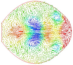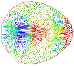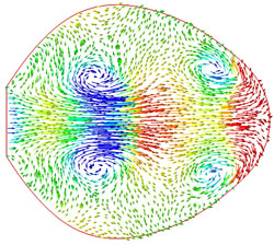 | Fig. 3. Velocity vectors colored by air pressure, from 0 to 4 s. For details, see [7]. |