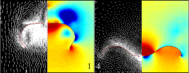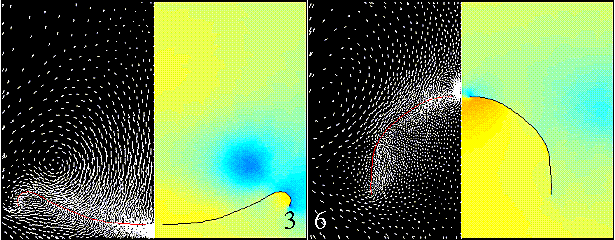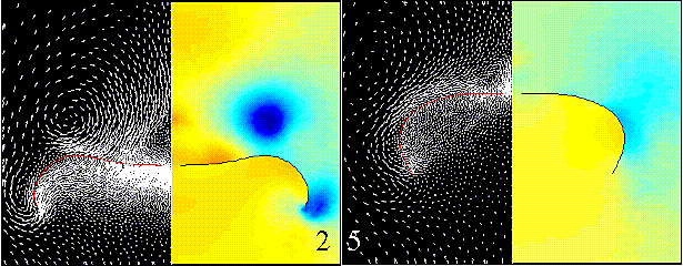 The following figures show the computed flow fields at six equally spaced instances in time during the overinflation of the parachute. The left side of each frame shows the canopy shape and surrounding vector velocity field with respect to the vertical motion of the skirt node. The right side shows the pressure field with blue representing low pressures and red representing high pressures.