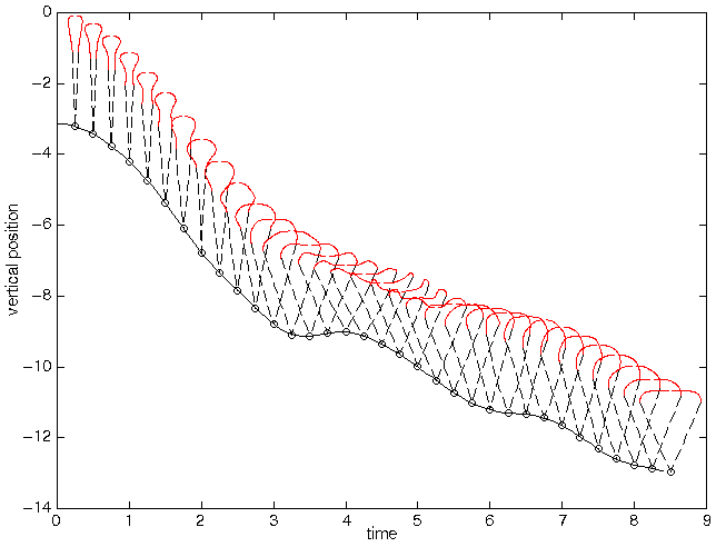 Opening of a Round ParachuteThe interactions between the parachute system and the surrounding flow field are dominant in most parachute operations and thus the ability to predict parachute fluid-structure interaction phenomena is of interest to the Army. The dynamics of parachutes are complex and difficult to model accurately. During both the inflation process and the terminal descent stage, the dynamics of a parachute are governed by a highly nonlinear coupling between the structural dynamics of the parachute system and the surrounding fluid flow. Semiempirical parachute models require experimental data in order to adjust the model to represent parachute phenomena. However, these models break down if the simulated problem deviates from the problem the empirical data supports. In order to capture accurately time-variant parachute dynamics, the structural dynamics and fluid dynamics must be addressed as a coupled system. For the coupled parachute simulation shown, the time-dependent Navier-Stokes equations governing the flow were solved using a stabilized space-time finite element formulation. The fluid dynamics model used an unstructured triangular mesh in which the parachute surface is defined by a set of adjacent nodes interior to the mesh. An automatic mesh moving scheme (with occasional remeshing) was used to handle deformations in the spatial domain due to the motions of the parachute canopy. The structural dynamics equations of motion were solved using a finite element formulation for a "tension structure" composed of cables, membranes, and concentrated masses. This formulation is being developed in collaboration with University of Connecticut to be extended to a large class of parachutes. The initial condition for the problem was that the parachute system was dropped from rest in its nonstressed configuration. The figures below show for an axisymmetric simulation the computed geometries and vertical position of the structural model at equally spaced instances in time. These plots show the inflation sequence as the canopy inflates, overinflates and collapses due to wake recontact and approaches a fully inflated "steady-state" geometry.