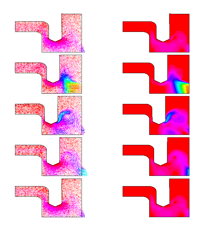 The figure below shows the velocity vectors (on the left) and the Mach number (on the right) at five times during one period of oscillation. An analysis of the piston indicates that it undergoes forced vibrations at 3 kHz, and several overtones of 3 kHz. It also vibrates at 13.5 kHz, indicating that 13.5 kHz is a natural frequency of the piston. The mesh generator and flow solver were developed by the T*AFSM.