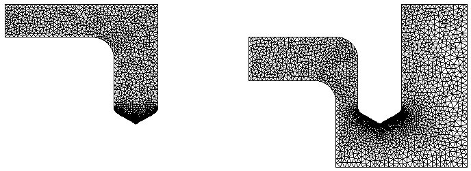 The motion of the piston is large enough that a new fluid mesh must be generated periodically in order to prevent unacceptible mesh deformation. The initial finite element mesh for the fluid consists of 2,489 nodes and 4,696 triangular elements. The mesh for the solid consist of 1,382 nodes and 2,570 triangular elements. These meshes are shown below. At every time step, approximately 14,000 nonlinear equations are solved to update the flow field, and 2,743 equations are solved to update the solid.