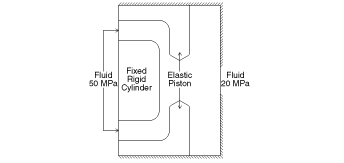 Fluid-Structure Interactions in Interior FlowsIn this fluid-structure interaction problem, we simulate the flow of a slightly compressible liquid and its interaction with a moving deformable solid. The problem is assumed to be axisymmetric. The fluid is governed by the Navier-Stokes equations for compressible flow and is assumed to be barotropic, which means that the pressure is a function of the density alone. The deformation of the piston is modelled using classical linear elasticity theory.A sketch of the problem is shown below. A pressure of 50 MPa is imposed on the left boundary, and a pressure of 20 MPa is imposed on the right boundary. The left end of the piston undergoes a forced, sinusoidal translation. The amplitude of the translation is 1.5 mm (the length from the left boundary to the right boundary is 5 cm), and the frequency of the translation is 3 kHz. Although the flow will stay relatively low speed (the highest Mach number is only about 0.4), the fluid must be considered compressible because of the high pressure.