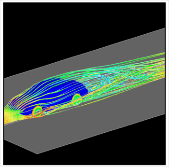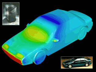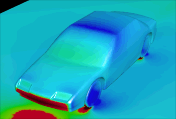 Airflow Past an AutomobileAirflow past an automobile (modeled after a Saturn SL2) at 55 miles per hour is simulated. The model is quite detailed and includes the wheels, recessed headlights, and a spoiler. This tetrahedral mesh contains 447,180 nodes and 2,801,488 elements. At each time step, a system of equations with 1,638,389 unknowns is solved using matrix-free iterations.The incompressible flow, with a modified Smagorinsky turbulence model, was computed under two flow conditions. The first simulation modeled road conditions. Here, we applied the free stream velocity to both the inflow boundary and the road, and we forced the wheels to spin (a rotational flow field was imposed on the tires). Zero velocity was imposed on the rest of the automobile. This flow condition yielded a drag coefficient of 0.433. The second simulation modeled wind tunnel conditions. Here, we applied the free stream velocity just at the inflow boundary, and applied slip conditions on the road. Zero velocity was imposed on both the tires and the automobile. This flow condition yielded a drag coefficient of 0.335. The actual drag coefficient of a Saturn SL2 automobile under wind tunnel conditions is 0.343. Shown in the figures are the pressure distribution on the automobile and the road (red being high pressure and blue being low pressure), and the streamlines around the automobile (the streamline colors represent the magnitude of the velocity). The simulations of flow past the automobile was also partially carried out on the Cray T3D. The unstructured mesh generator, flow solver, and flow visualization software (based on Visual3 library and Wavefront) were developed by the T*AFSM. The flow simulations for the automobile were part of an effort by the T*AFSM researchers, partially funded by the Advanced Research Projects Agency, for the development of scalable libraries for fluid mechanics applications.