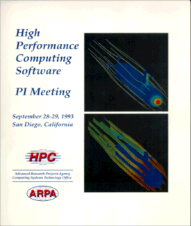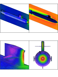 Flow Around a SubmarineIn this problem we simulate flow around a Los Angeles-class submarine. We use a stabilized finite element method together with an unstructured mesh to solve this problem. The images below on the left appeared on the cover page of the Slide Book of the ARPA High Performance Computing Software PI Meeting, San Diego, California, September 27-29, 1993. The top image shows the streamlines and the pressure distribution on the surface of the submarines, while the bottom image shows the stream ribbons color-coded with the axial velocity.The Reynolds number based on the free-stream velocity and the hull length is one billion. A Smagorinsky turbulence model was used in this unsteady computation, which was restarted from a steady-state solution at Reynolds number one million. We employed a spatial mesh consisting of 71,035 nodes and 345,129 tetrahedral elements. This resulted in 466,688 coupled equations that were solved iteratively. A similar simulation was performed later at higher resolution. The flow solver and flow visualization software (based on Visual3 library) were developed by the T*AFSM. The flow simulation for the submarine is part of an effort by the T*AFSM researchers, partially funded by the Advanced Research Projects Agency, for the development of scalable libraries for fluid mechanics applications. References:1. T.J.R. Hughes, T.E. Tezduyar and A.N. Brooks, "Streamline Upwind Formulations for Advection-Diffusion, Navier-Stokes, and First-order Hyperbolic Equations", Proceedings of the Fourth International Conference on Finite Element Methods in Fluid Flow, University of Tokyo Press, Tokyo (1982). 2. T.E. Tezduyar, "Stabilized Finite Element Formulations for Incompressible Flow Computations", Advances in Applied Mechanics, 28 (1991) 1-44. 3. T.E. Tezduyar, M. Behr and T.J.R. Hughes, "High Performance Finite Element Computation of Fluid Dynamics Problems", Computational Fluid Dynamics Review 1995 (eds. M. Hafez and K. Oshima), John Wiley & Sons (1995) 300-321. 4. T.E. Tezduyar, M. Behr and T.J.R. Hughes, "Finite Element Methods", Section 19.3 in Handbook of Fluid Dynamics and Fluid Machinery, John Wiley & Sons (1996). |